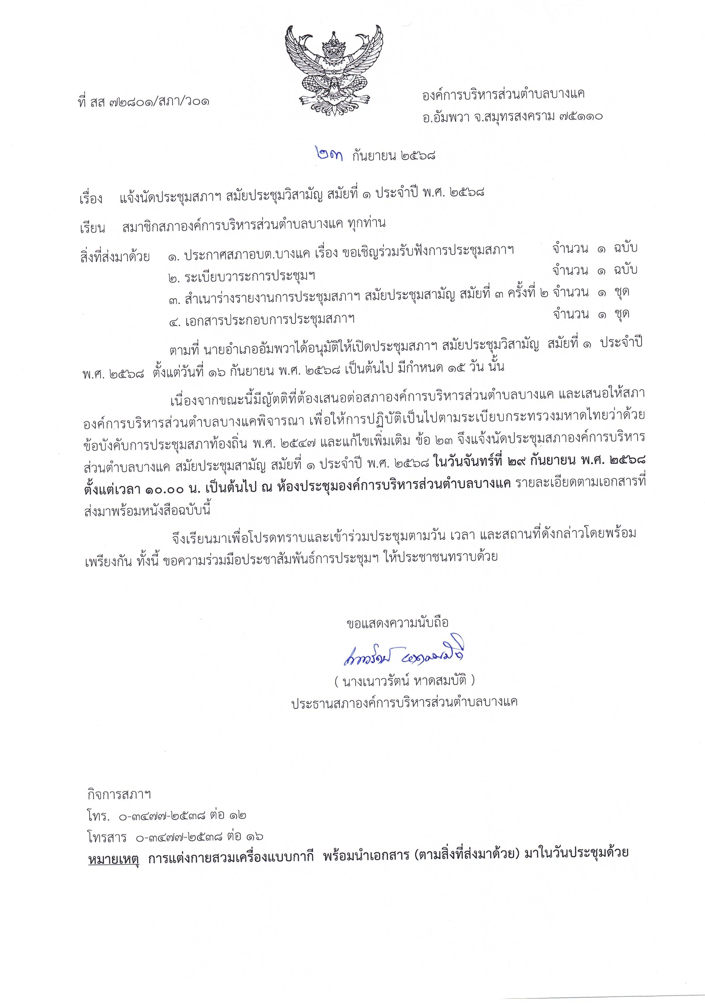 แจ้งนัดประชุมสภา อบต.บางแค สมัยประชุมวิสามัญ สมัยที่ 1 ประจำปี พ.ศ.2568