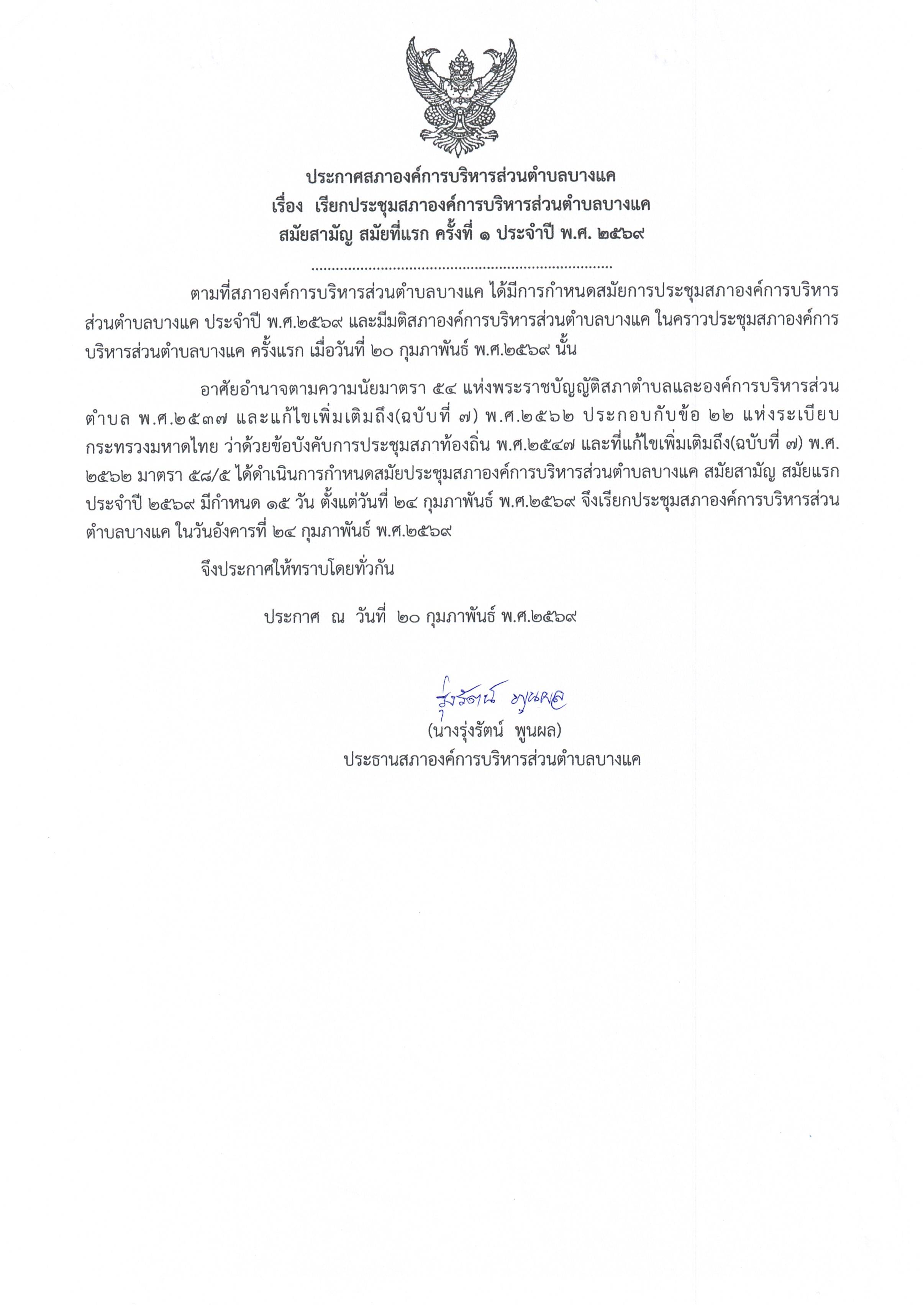 ประกาศสภา อบต.บางแค เรื่องเรียกประชุมสภา อบต.บางแค สมัยสามัญ สมัยแรก ครั้งที่ 1/2569